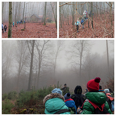 Nachdem wir ein Stück in den Wald gelaufen sind, untersuchten wir zu allererst die Buche: Die Buche ist die „Chefin im Wald“ und ihre Wurzeln unter der Erde sind genauso lang wie die Äste der Baumkrone! Wir staunten nicht schlecht wie groß so eine Baumkrone und ihre Wurzeln sind! Nachdem wir im Gänsemarsch durch die dichte Dickung bei Kälte und Nebel marschiert sind, tauchte plötzlich völlig unerwartet ein kleines „Hexenhäuschen“ auf! Nein, natürlich war dort keine Hexe, sondern ein kleines Forsthäuschen, an dem wir Rast gemacht haben und uns erst einmal stärken durften! Denn – danach ging es weiter: Unser Auftrag lautete: Baut im Dreierteam ein kleines Häuschen für die Wichtel! Fleißig sammelten und bauten wir kleine Häuschen für die Wichtel.