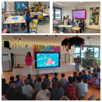 Um die Zeit bis Weihnachten zu verkürzen, treffen sich die Schüler und Schülerinnen der Grundstufe jeden Dienstagmorgen gemeinsam in der Aula. Dort singen sie gemeinsam Lieder, um anschließend in einen vorher ausgewählten Workshop zu gehen.Um die Zeit bis Weihnachten zu verkürzen, treffen sich die Schüler und Schülerinnen der Grundstufe jeden Dienstagmorgen gemeinsam in der Aula. Dort singen sie gemeinsam Lieder, um anschließend in einen vorher ausgewählten Workshop zu gehen.